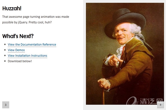 Booklet可能是拥有最多选项的插件。你可以通过键盘,链接,或者定时自动翻页。每一页都有一个单独的URL,可以被收藏。