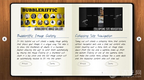 Turn.js 是一个轻量级的 (15kb) jQuery/html5 插件用来创建类似书本和杂志翻页效果,支持触摸屏设备。